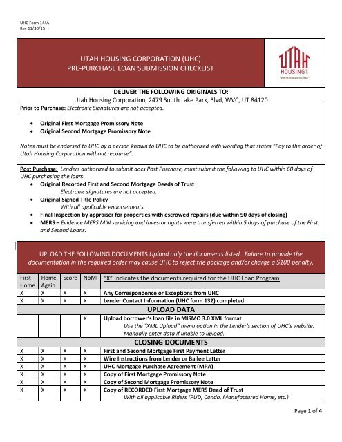 Form 144a Loan Submission Checklist Utah Housing Corporation